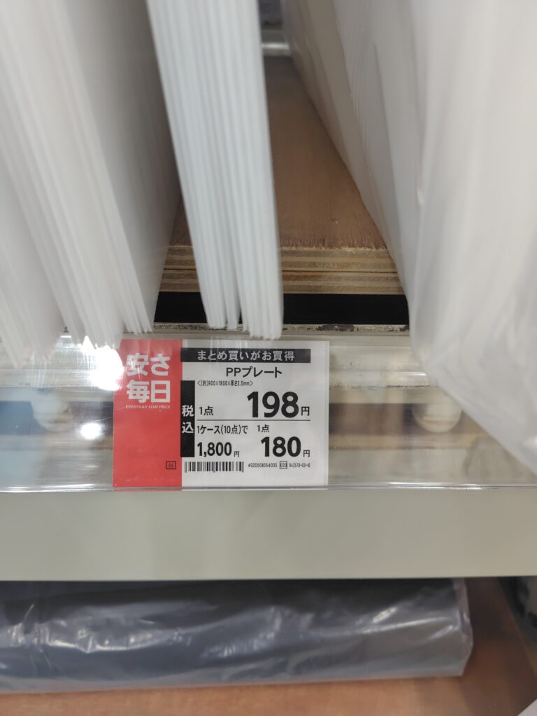 | PPプレート(プラダン) | 900mm × 1800mm ×厚さ2.5mm | コメリ | 198円 |