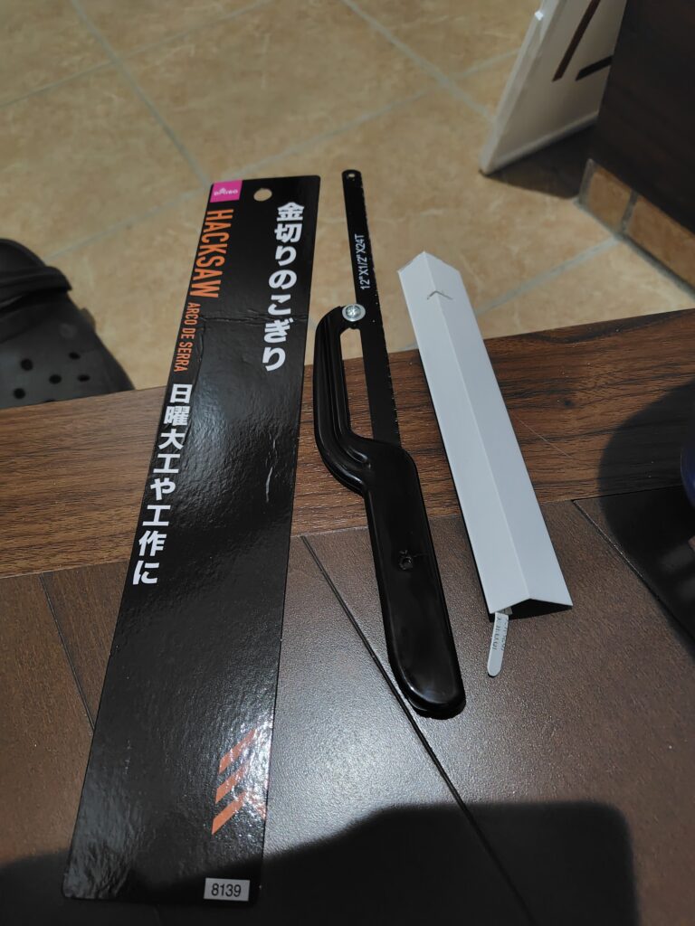 ※見切りの切断には、下記写真のダイソー商品「金切りのこぎり」を使用しました。税込110円のため、工具をお持ちでない方はこちらで十分対応できます。 - 見切りにすきまテープを張り付ける