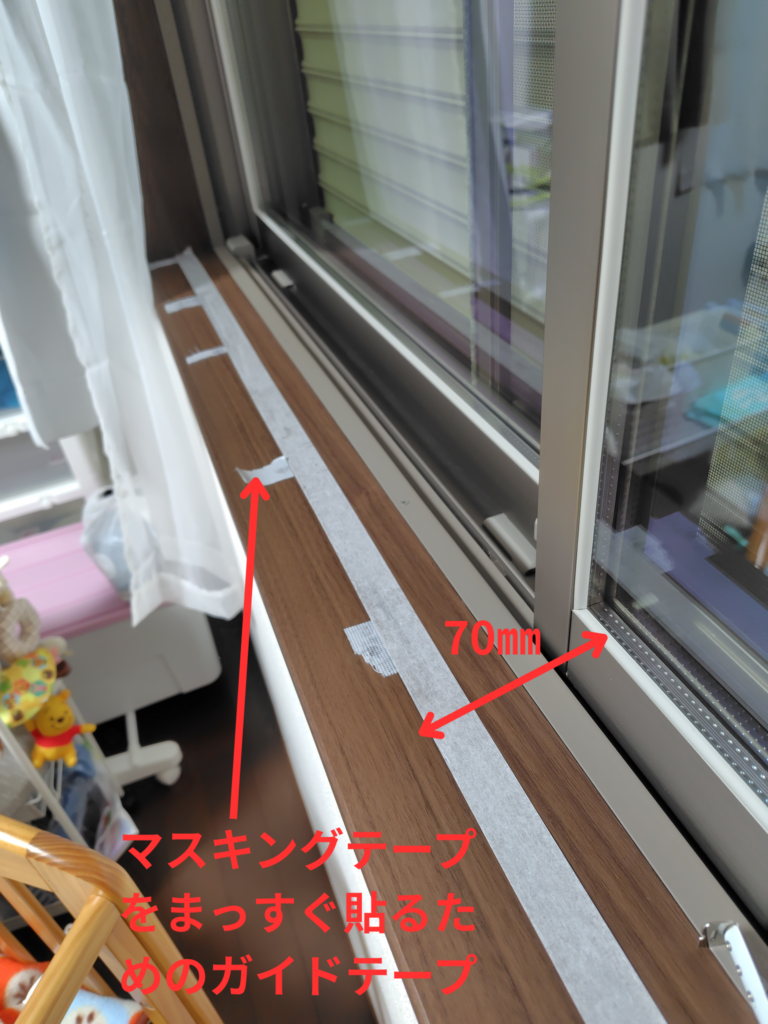 - 窓から50~70㎜(今回は70㎜)の箇所にマスキングテープをまっすぐ貼る。