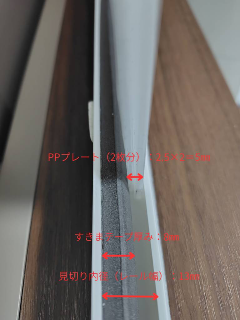 ちなみに、PPプレート厚さ4mmの製品を使用する場合は、厚さ5mmのすきまテープを選ぶとちょうど良いサイズになります