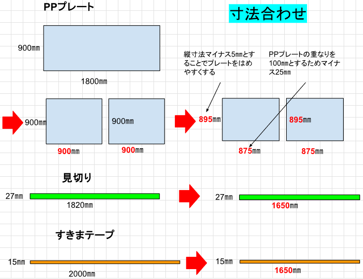 カット後縦:900㎜ - 5㎜ = 895㎜