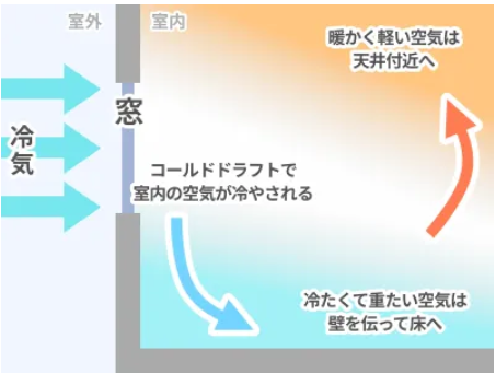 窓付近は外からの冷気が侵入して床に溜まり、暖かい空気が天井に移動します。この空気の流れが繰り返されることで部屋が冷えていきます。