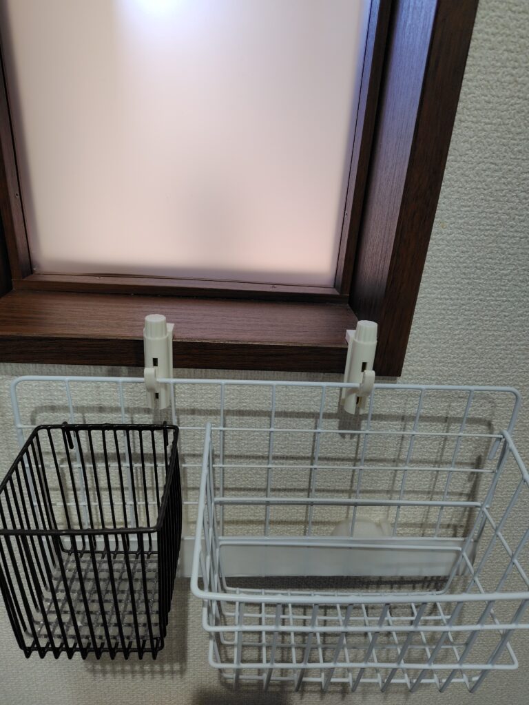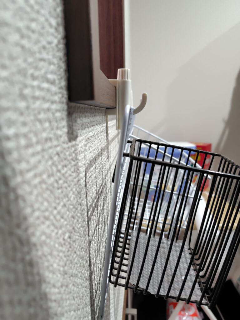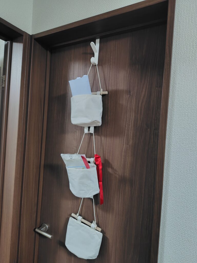 下の写真のように、ドアの上端に引っ掛けるだけでOK。かもいフックと同じ感覚で、ウォールポケットを吊り下げることができます。こちらもダイソー、セリアなど100円均で購入可能です。「うちは枠がないから…」と諦める前に、ぜひ試してみてください。