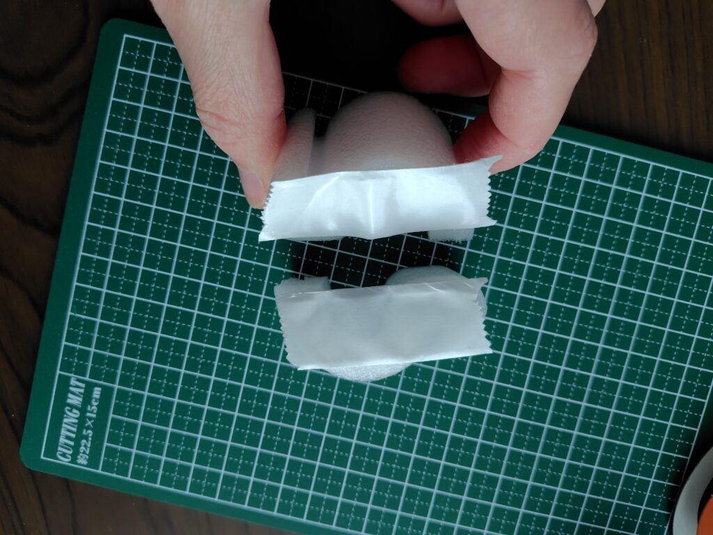- 「縦半分」に割り両面テープを貼る: もともとΩ(オメガ)型をしているので、縦に真っ二つに切ると、いびつな「S字」型となります。これに両面テープを貼ります。