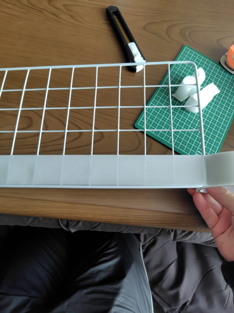 - カットした支柱(ぶつかり防止クッション)を養生テープの上に接着します。
