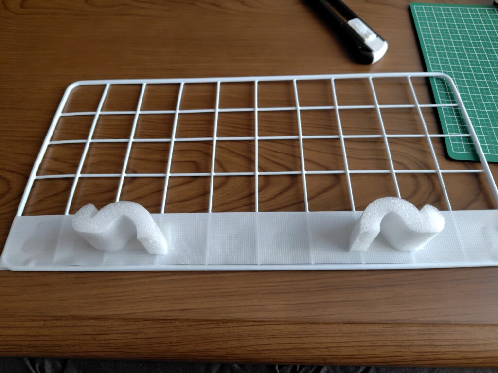 ここで、この記事一番のポイントをご紹介します。ワイヤーネットが斜めになるのを防ぐために、ぶつかり防止クッションを支柱(スペーサー)として活用します。