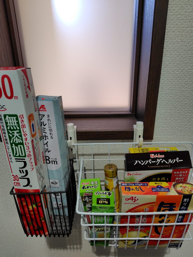 今回は縦長タイプのワイヤーネットとラックをセレクトしました。ラップや調味料などの背が高いアイテムも、深さのあるラックなら倒れる心配がなく、安定して収納できるからです。