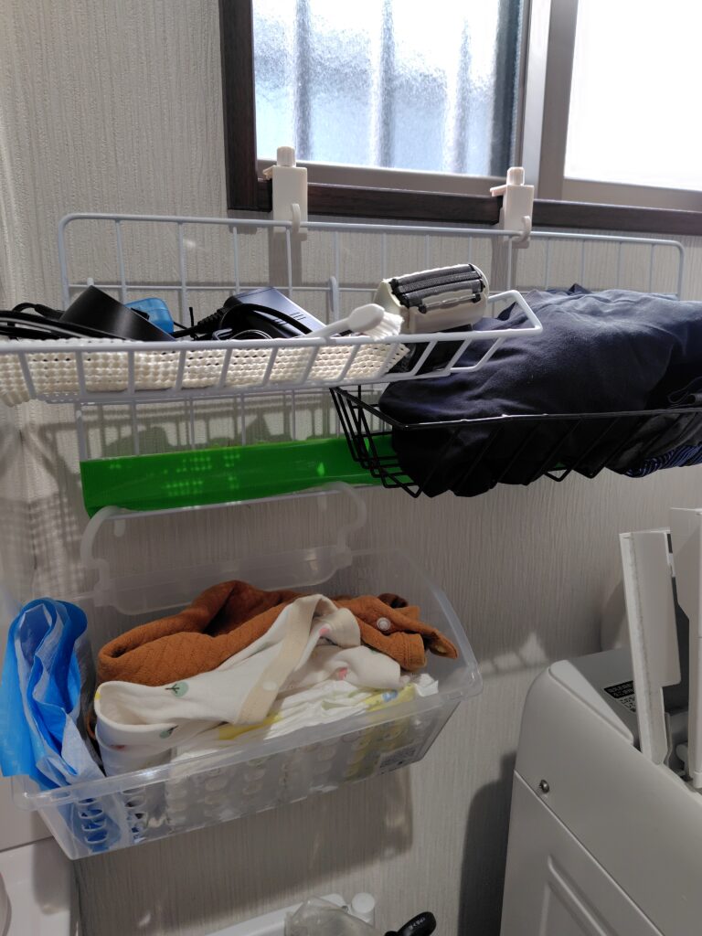 パパ用の洗面用品やインナー類は上段(ワイヤーラック)に、子ども服は下段(フック付きかご)に収納しています。パパ用品は取り出しやすさを重視して浅皿タイプのラックを使用。子ども服は、セリアで購入した「ミエル フック」をワイヤーネットにかけて収納しています。