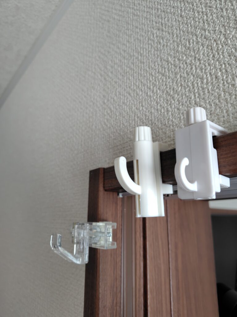 | かもいフック | ダイソー、セリア | ダイソーの「はさんでガッチリ止まるフック」が耐荷重2kgあり、強度が高くおすすめ。 |