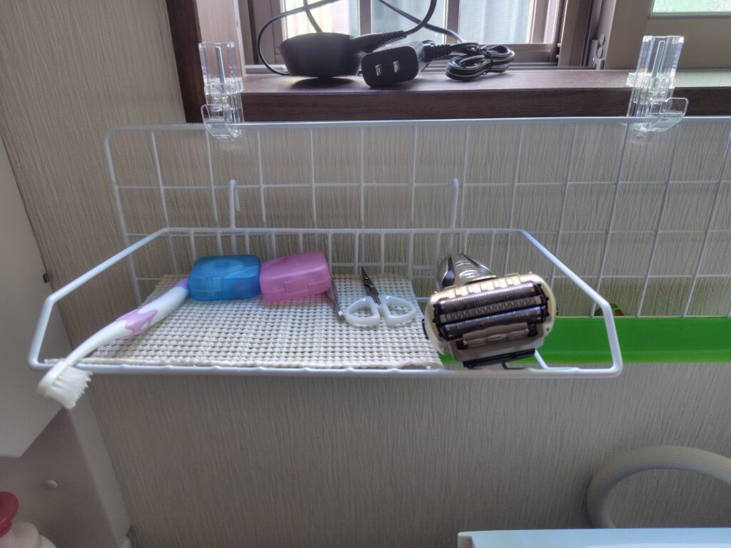 洗面台横の窓枠に設置。必要品をさっと取れるよう平型のワイヤーラックを採用しました。